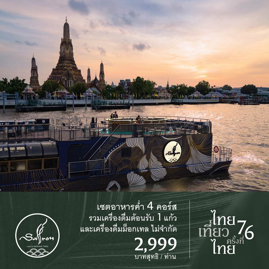 เรือ แซฟฟรอน ครูซ เซตอาหารค่ำ 4 คอร์ส พร้อมเครื่องดื่มต้อนรับ 1 แก้ว และสปาร์คลิ้งไวน์ 1 แก้ว