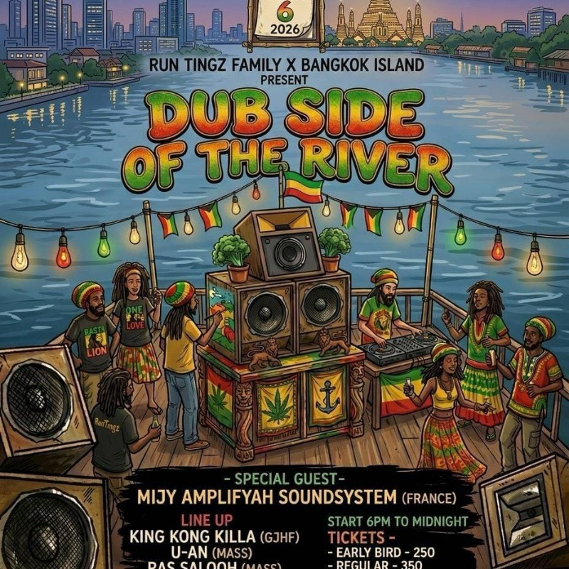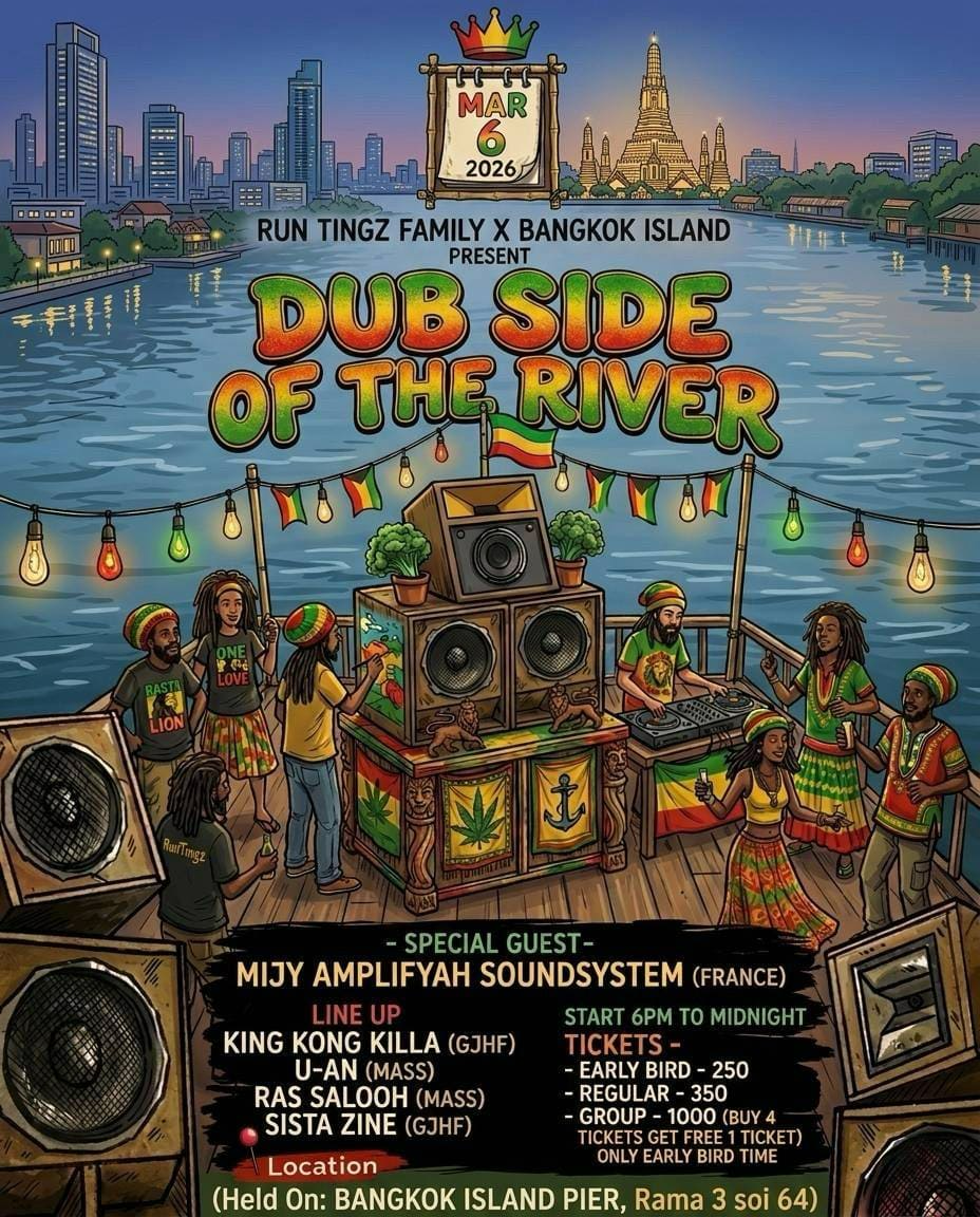 A Reggae Dub event on the Bangkok Island boat, hosted by RunTingz Family x Bangkok Island. Experience authentic Reggae Sound System culture with heavy bass music, including Reggae, Dub, Steppas, Heavy Bass, and Jungle DnB—all set to hit your senses with full power.