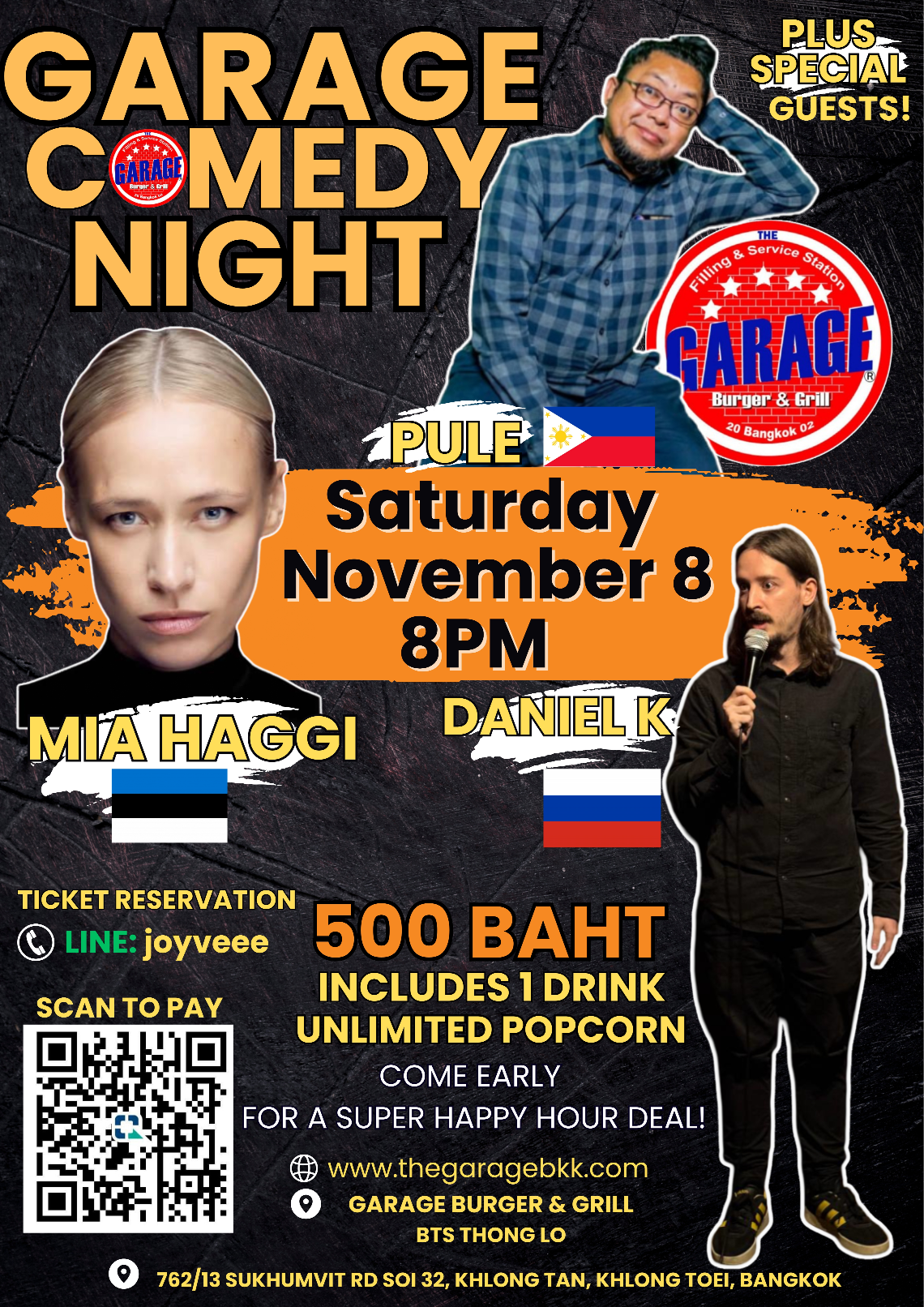 Garage comedy night is back! Pule is bringing a diverse lineup of comedians to satisfy your comedy fix, Saturday, November 8, Garage burger & Grill, Sukhumvit Soi 32.