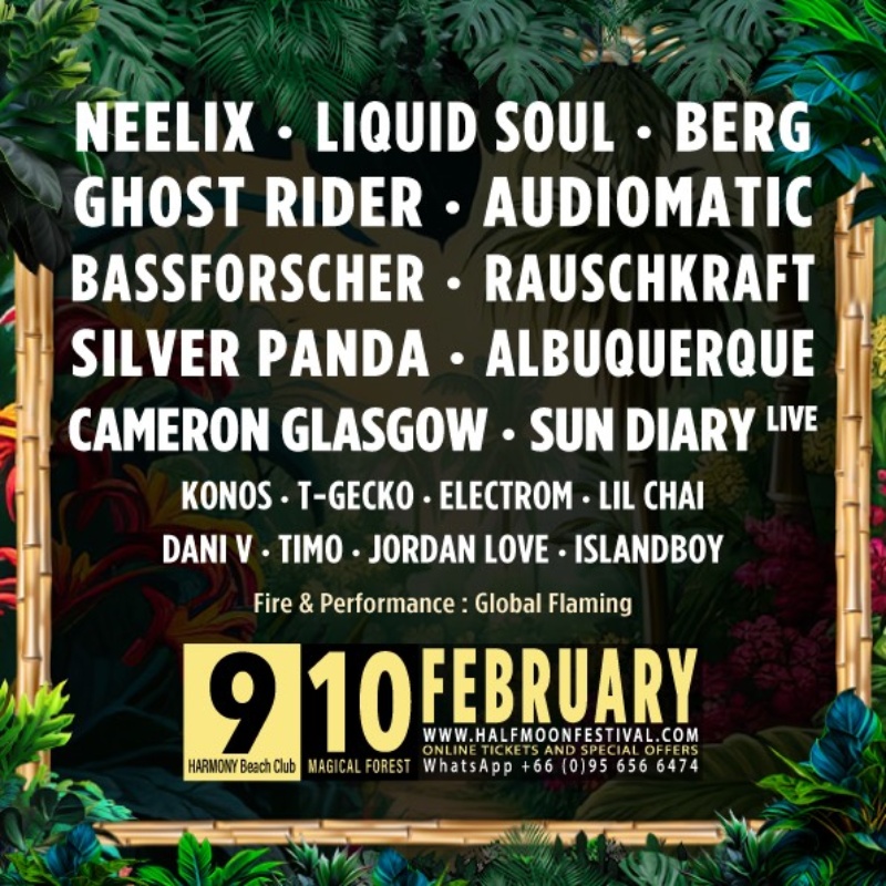 Halfmoon Festival returns for a two-day celebration of music, human connection, and the true island spirit. Experience both sides of Koh Phangan — A day to night beachfront celebration at Harmony Beach Club and the legendary all-night open air festival deep within the Magic Forest.