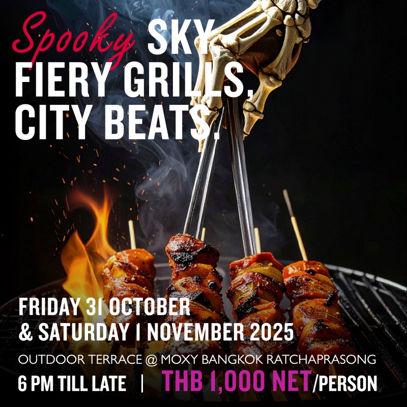 On Friday 31 Oct & Saturday 1 Nov, the Moxy Backyard BBQ transforms into a Halloween Buffet — smoky grills, wickedly good bites, and cheeky cocktails under Bangkok’s glowing skyline.