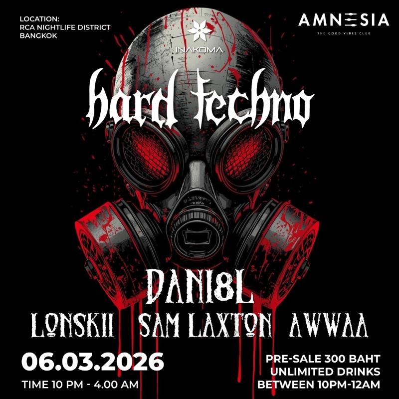 INAKOMA: Thailand's #1 Hard Techno Underground Rave Every Friday Night. 10 PM – 4:00 AM at AMNESIA in RCA Bangkok. The Best Underground Techno Experience in Bangkok Join us for a night of hard-hitting techno this Friday at AMNESIA, the ultimate venue for true techno lovers! #hardtechno #bangkok #party #rave #thailand
