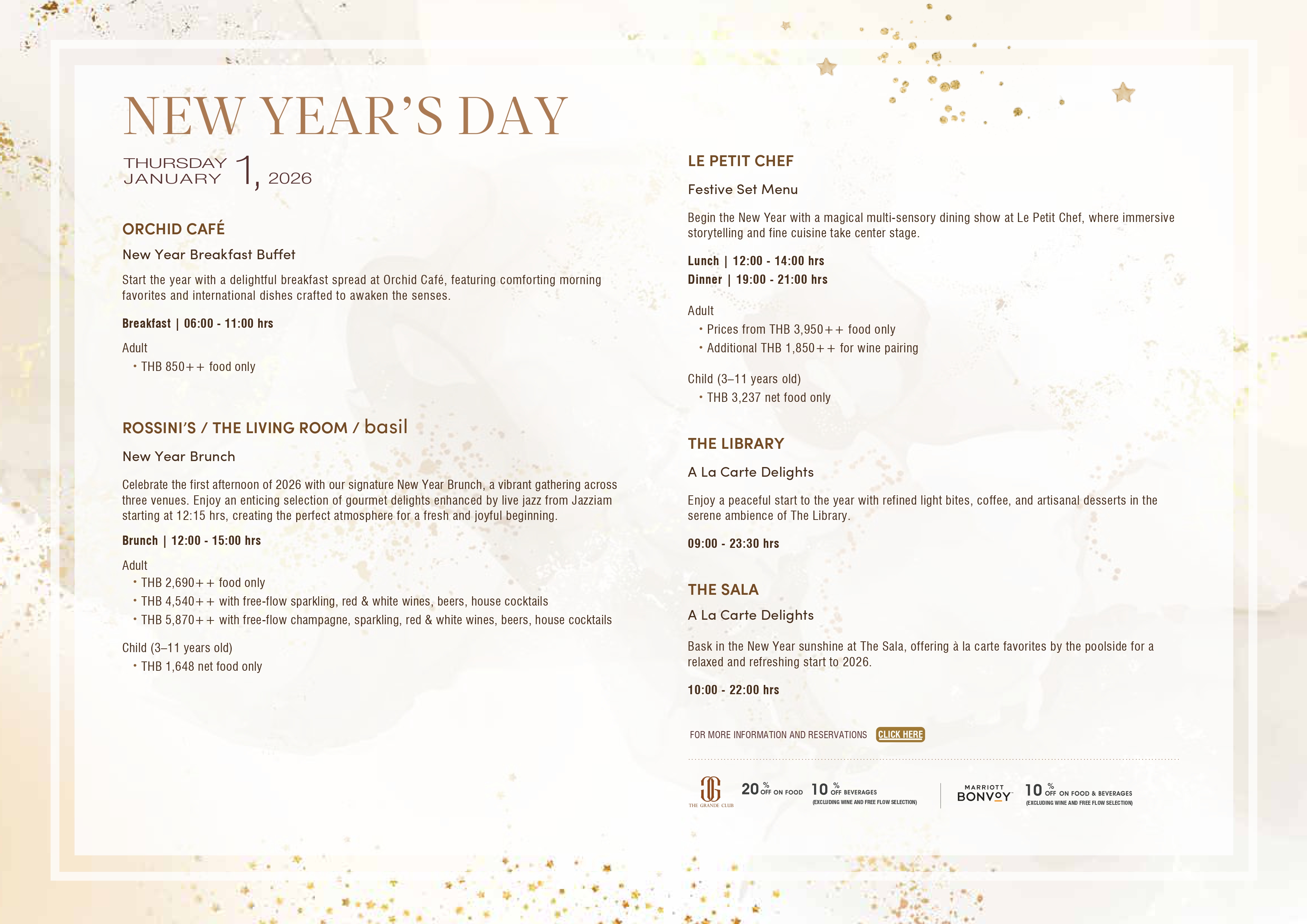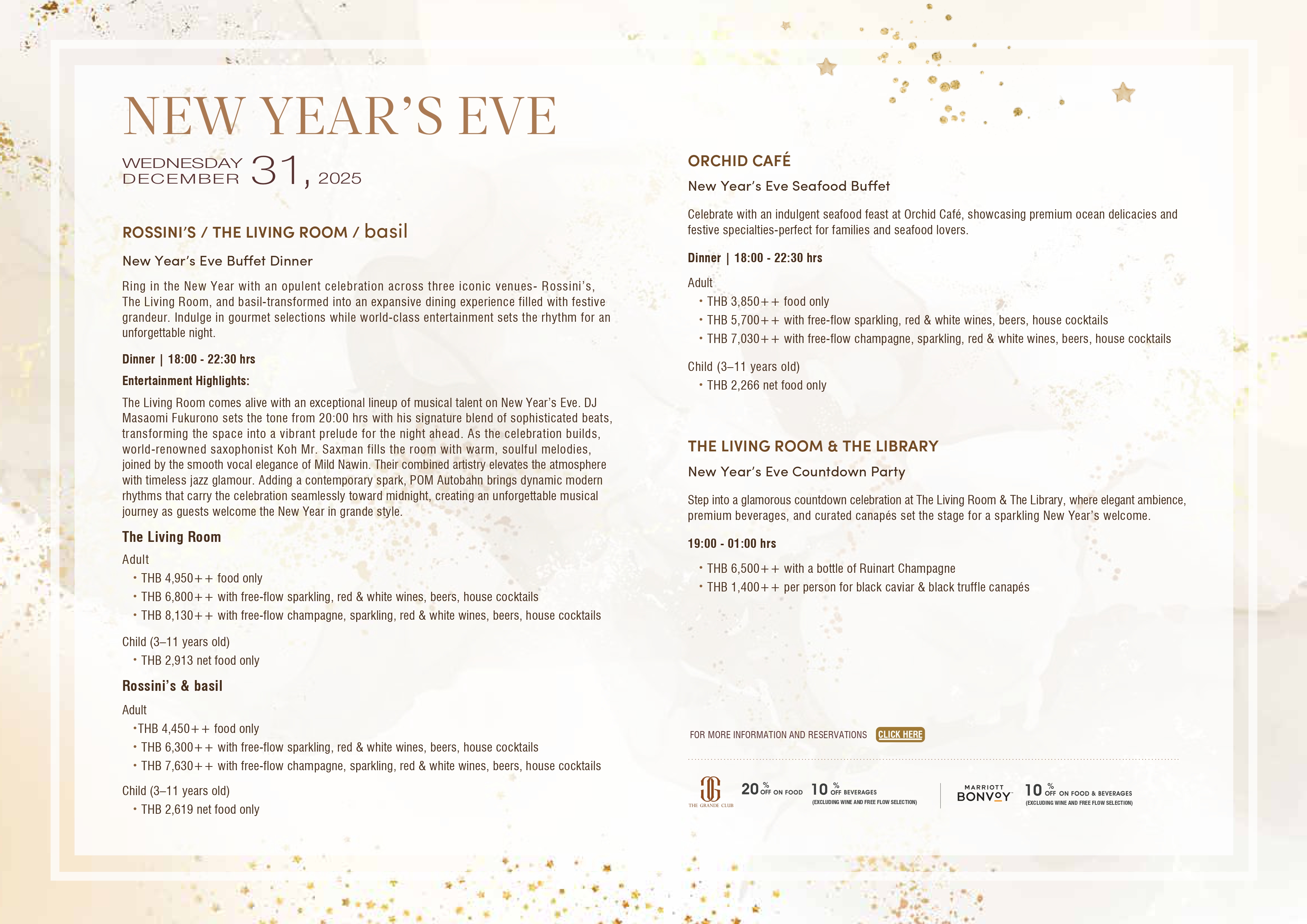 The Living Room comes alive with an exceptional lineup of musical talent on New Year’s Eve. DJ Masaomi Fukurono sets the tone from 20:00 hrs with his signature blend of sophisticated beats, transforming the space into a vibrant prelude for the night ahead. As the celebration builds, world-renowned saxophonist Koh Mr. Saxman fills the room with warm, soulful melodies, joined by the smooth vocal elegance of Mild Nawin. Their combined artistry elevates the atmosphere with timeless jazz glamour. Adding a contemporary spark, POM Autobahn brings dynamic modern rhythms that carry the celebration seamlessly toward midnight, creating an unforgettable musical journey as guests welcome the New Year in grande style.