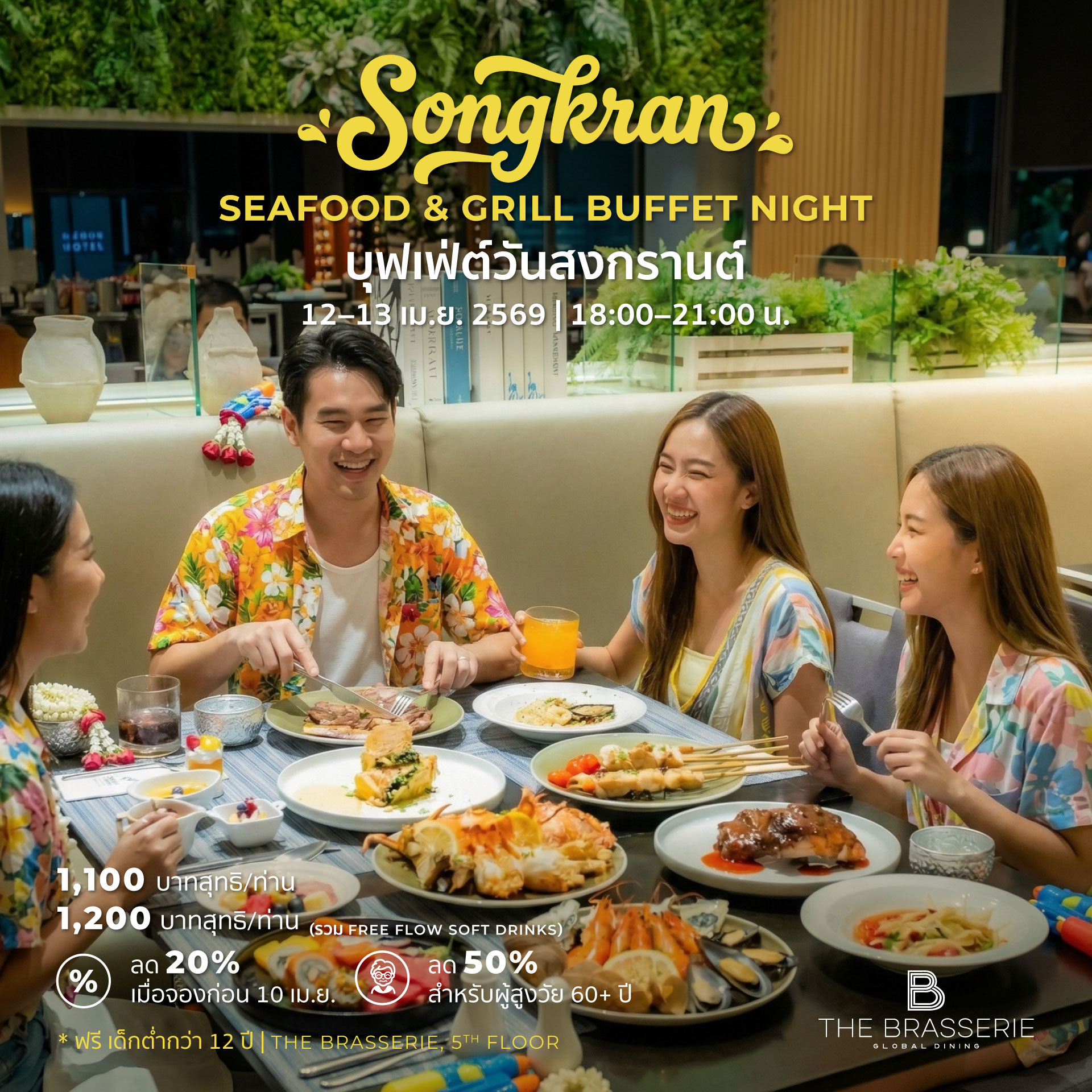 Celebrate Songkran with a vibrant buffet featuring fresh seafood, BBQ selections, and authentic Thai dishes in festive atmosphere.