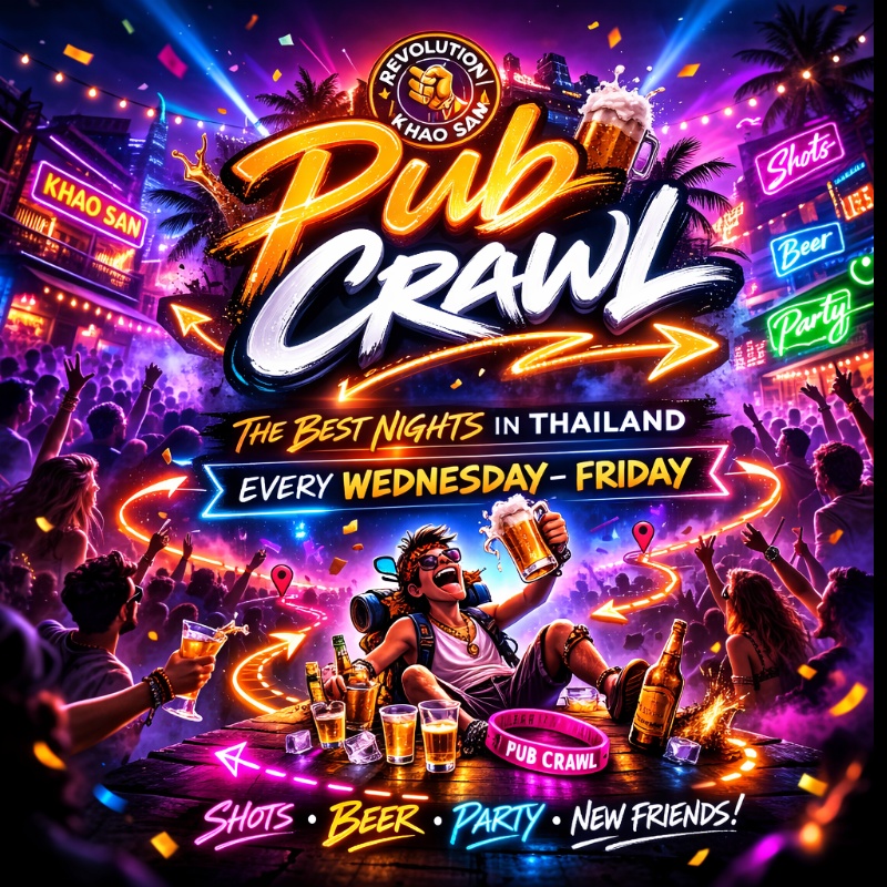Join the Khaosan Road Pub Crawl hosted by Revolution Hostel by The Bliss and dive into one of the most legendary nightlife streets in the world.