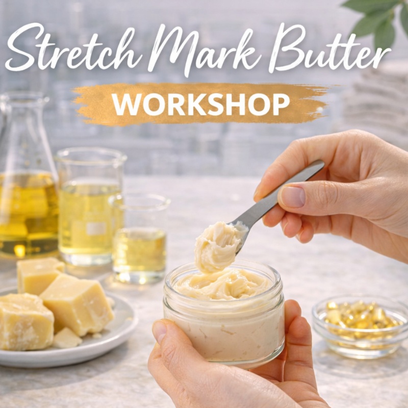 Stretch Mark Butter Formulation Workshop — Learn how to formulate a rich, targeted body butter designed to support skin elasticity and deeply nourish the skin using a blend of butters, botanical oils, and functional active ingredients. This workshop focuses on understanding ingredient selection, texture balance, and absorption to help address concerns such as stretch marks, dryness, and loss of firmness—resulting in a skin-loving butter that supports smoother, more resilient-looking skin and can be confidently recreated.