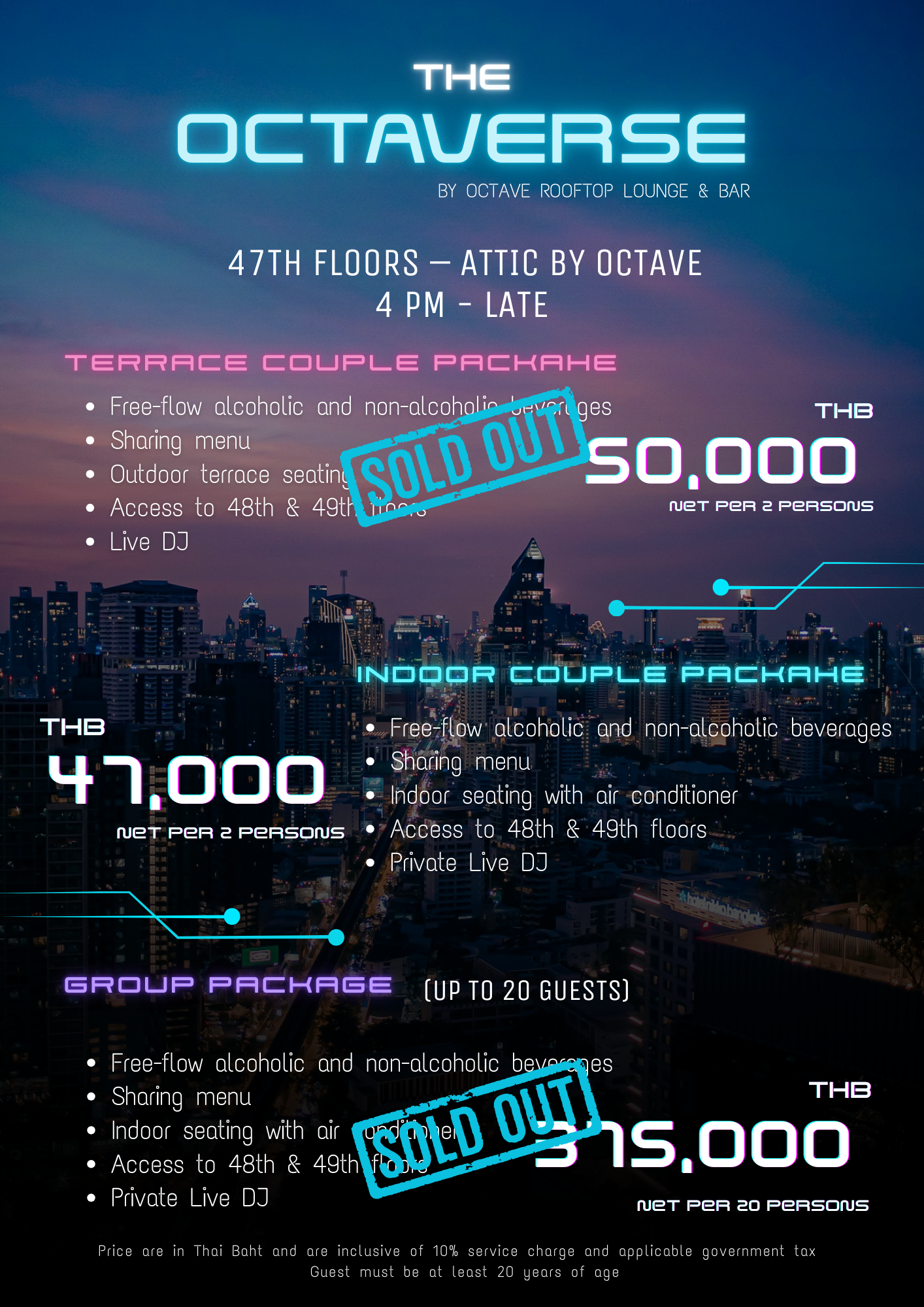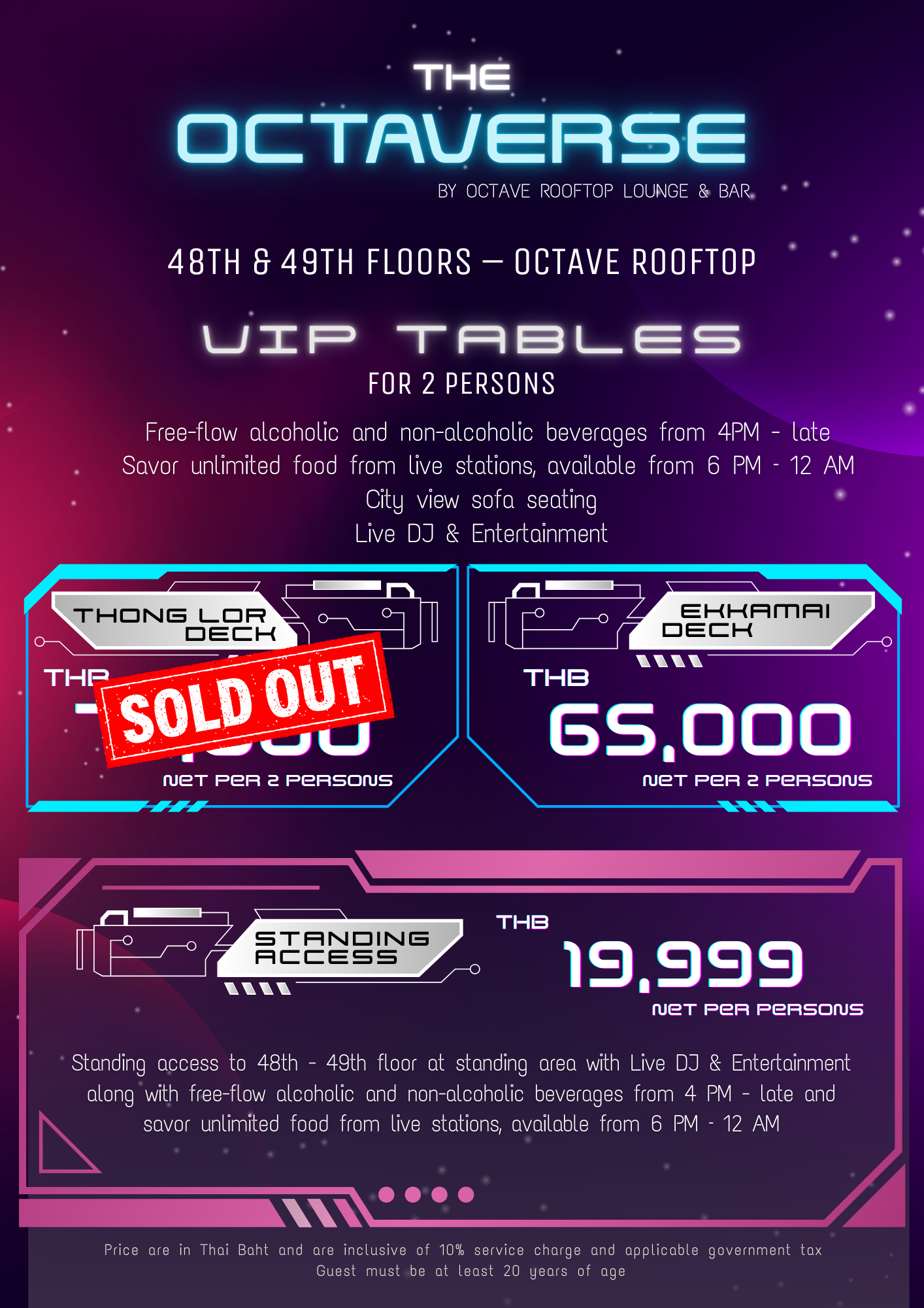 - Age Restriction: This event is exclusively for guests aged 20 years and above on the 47th, 48th, and 49th floors. Guests of all ages are welcome to the celebration on the 45th floor.