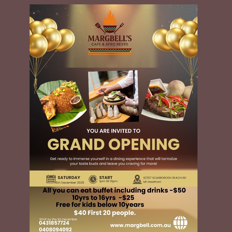Get ready to embark on an exquisite culinary and cultural journey — Margbell’s Cafe & Resto is opening its doors for the very first time! 🍽️✨ Experience the warmth, vibrancy, and irresistible flavors of Africa right in the heart of your community!